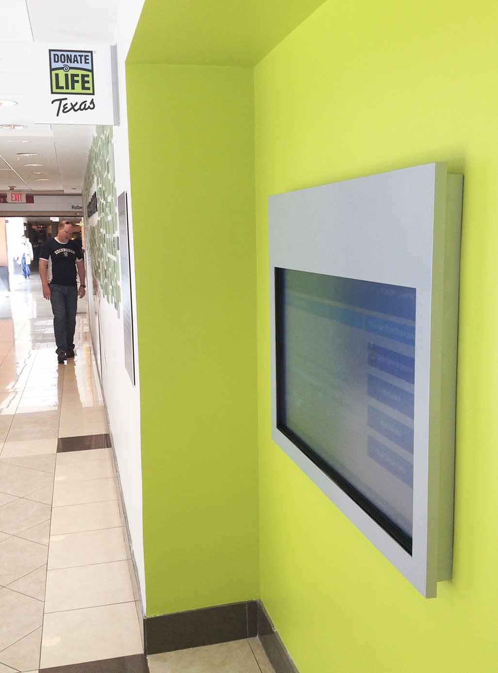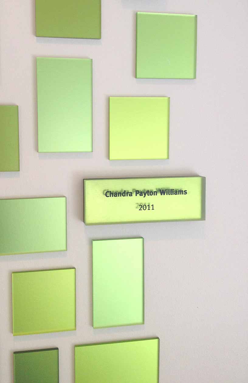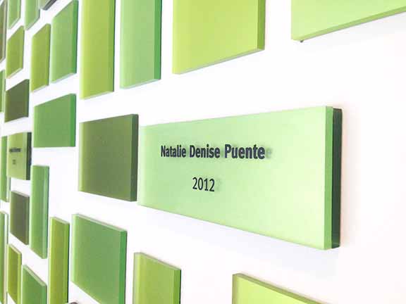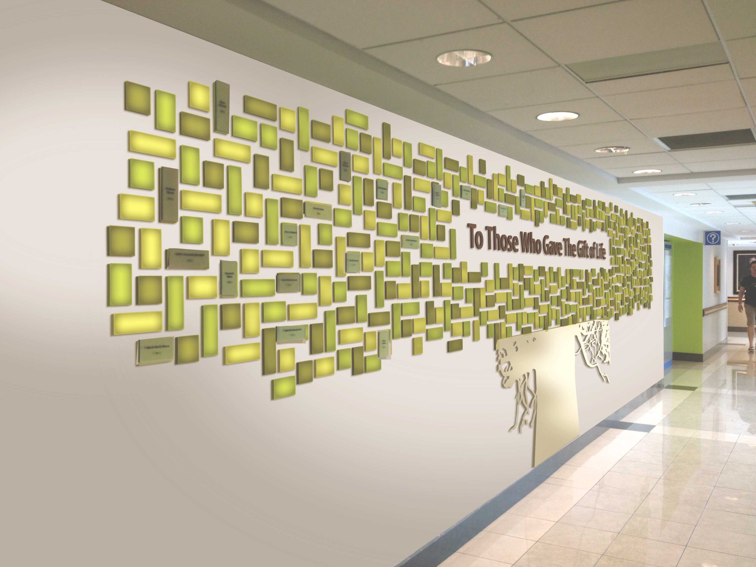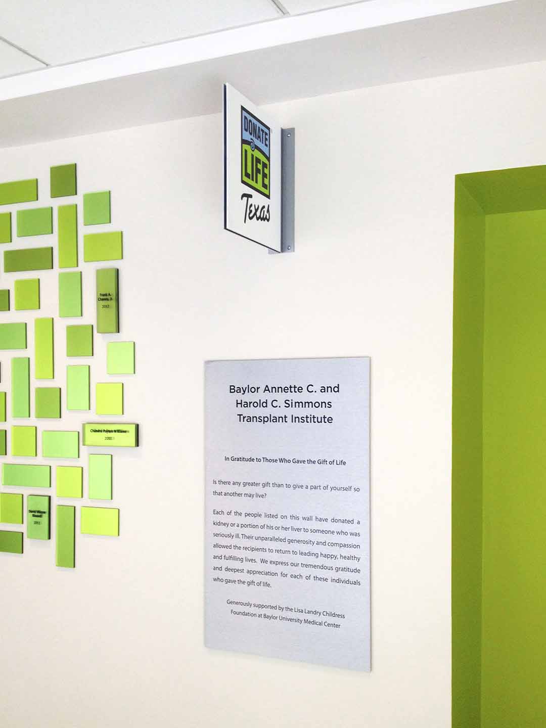 Everyone likes to get a little recognition for their good deeds, and along the hallway on a wall at Baylor University Medical Center, people who have done one selfless deed are getting the credit they may not ask for… but richly deserve. focusEGD had the privilege to be a part of this donor recognition program for the Annette C. and Harold C. Simmons Transplant Institute by designing and planning for this artistic and organic feature. The program features 480 plaques in various shades to present the form of a tree, as this program grows and “branches out” for future life-giving donations.