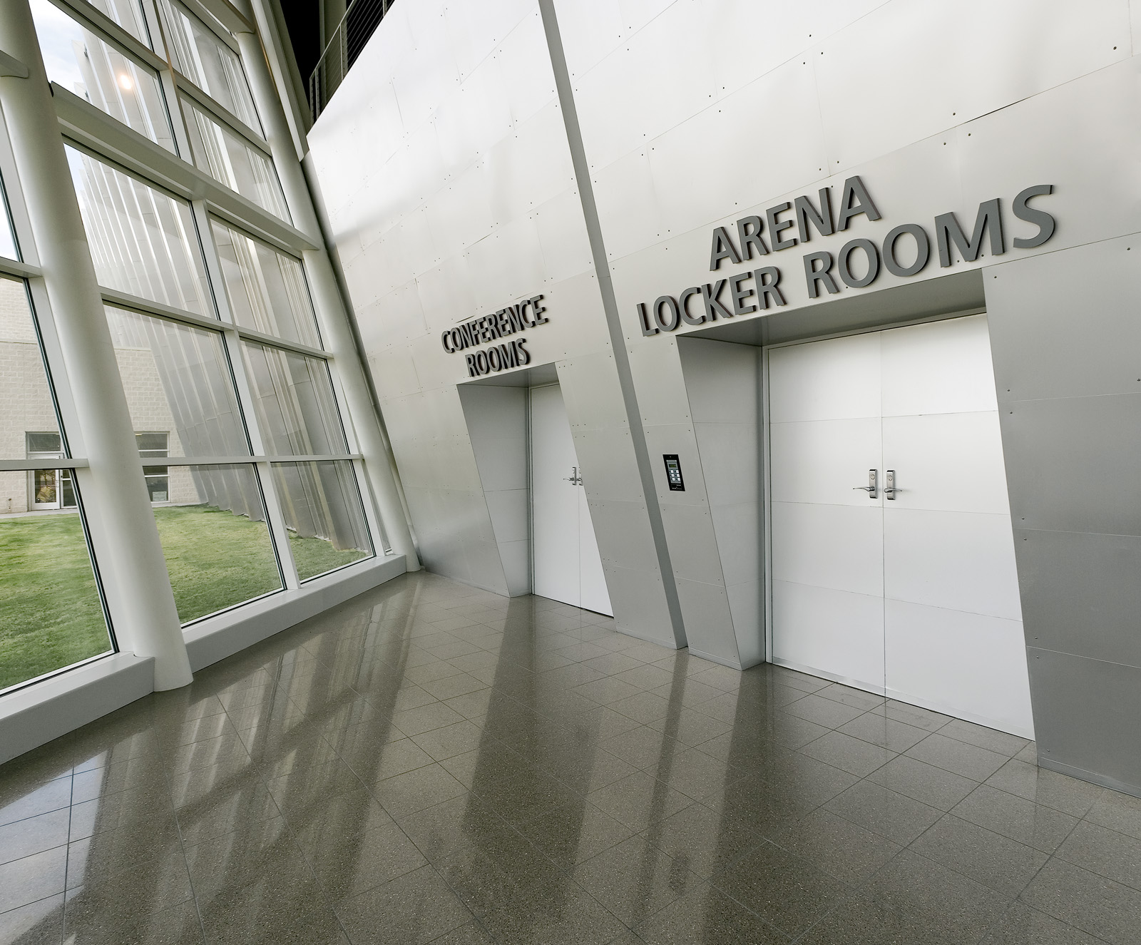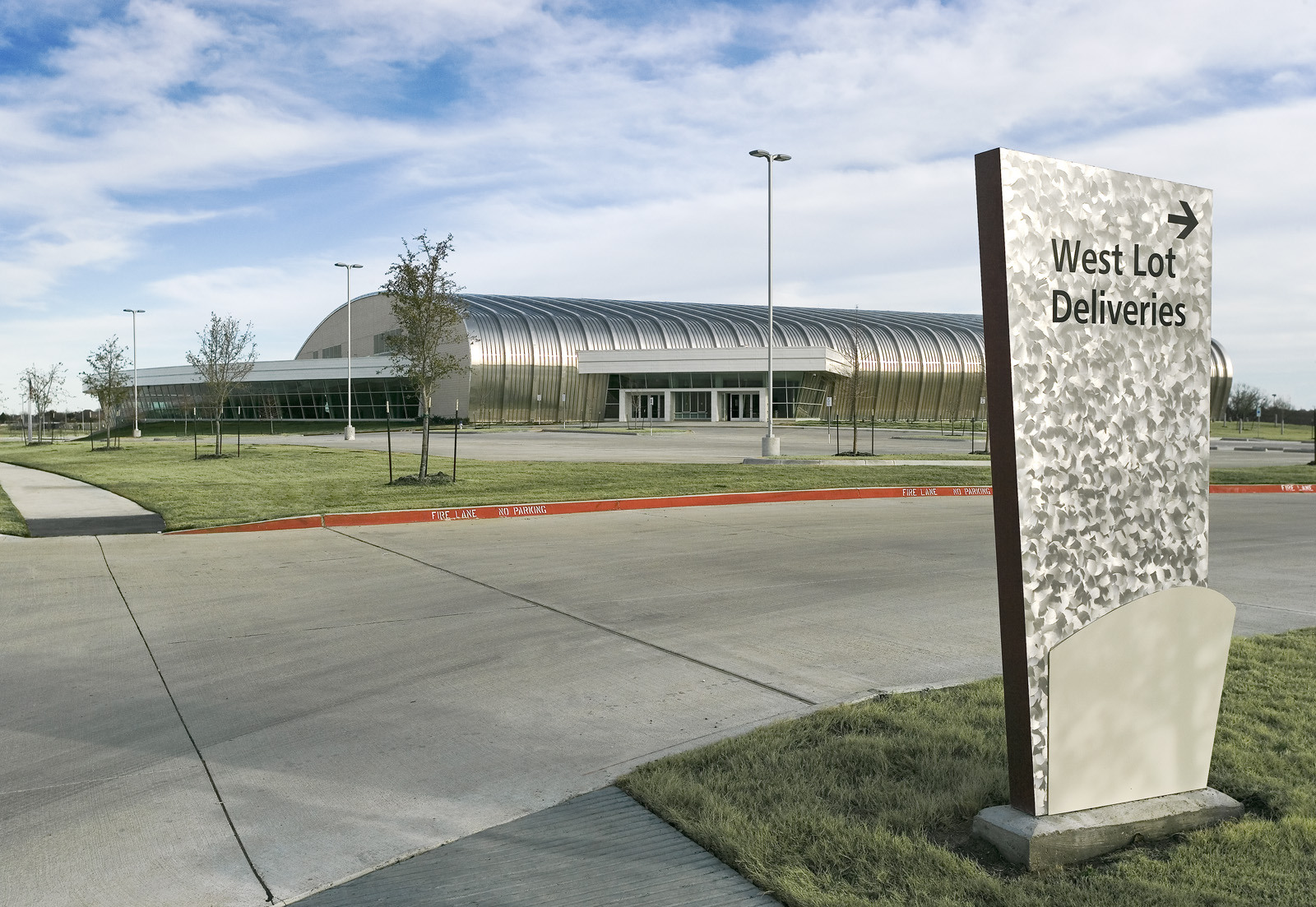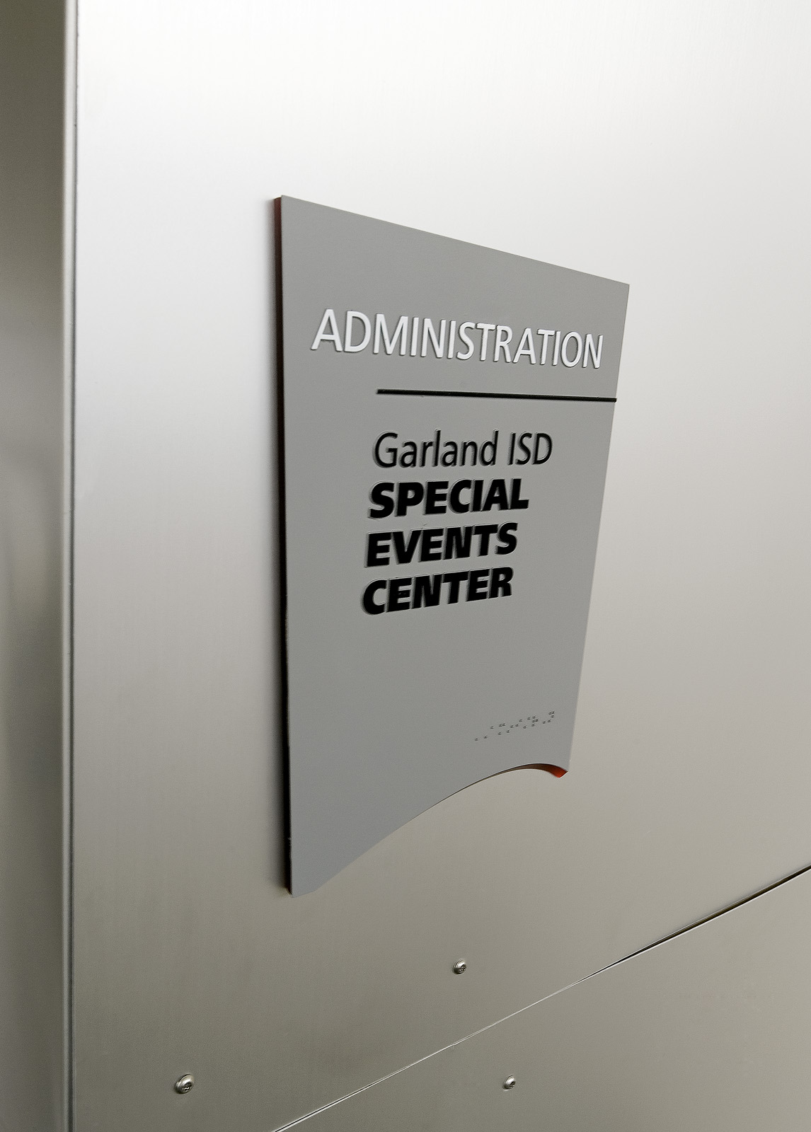 The City of Garland, Texas now has a venue for not only for sporting events but for musical, theatrical and commencement exercises as well. The building’s architectural features include a dramatic sweeping curved roof and a multitude of various angled walls, which inspired the signage and wayfinding elements to follow suit. Budget driven solutions make use of standard materials and details in unique fashions to accomplish a sculptural look.