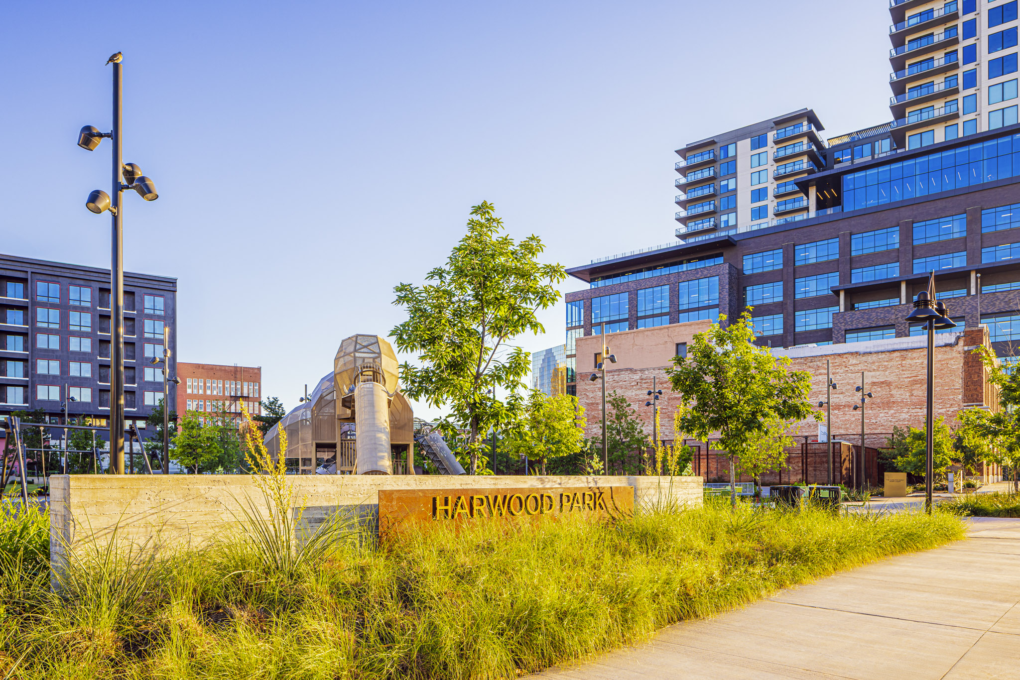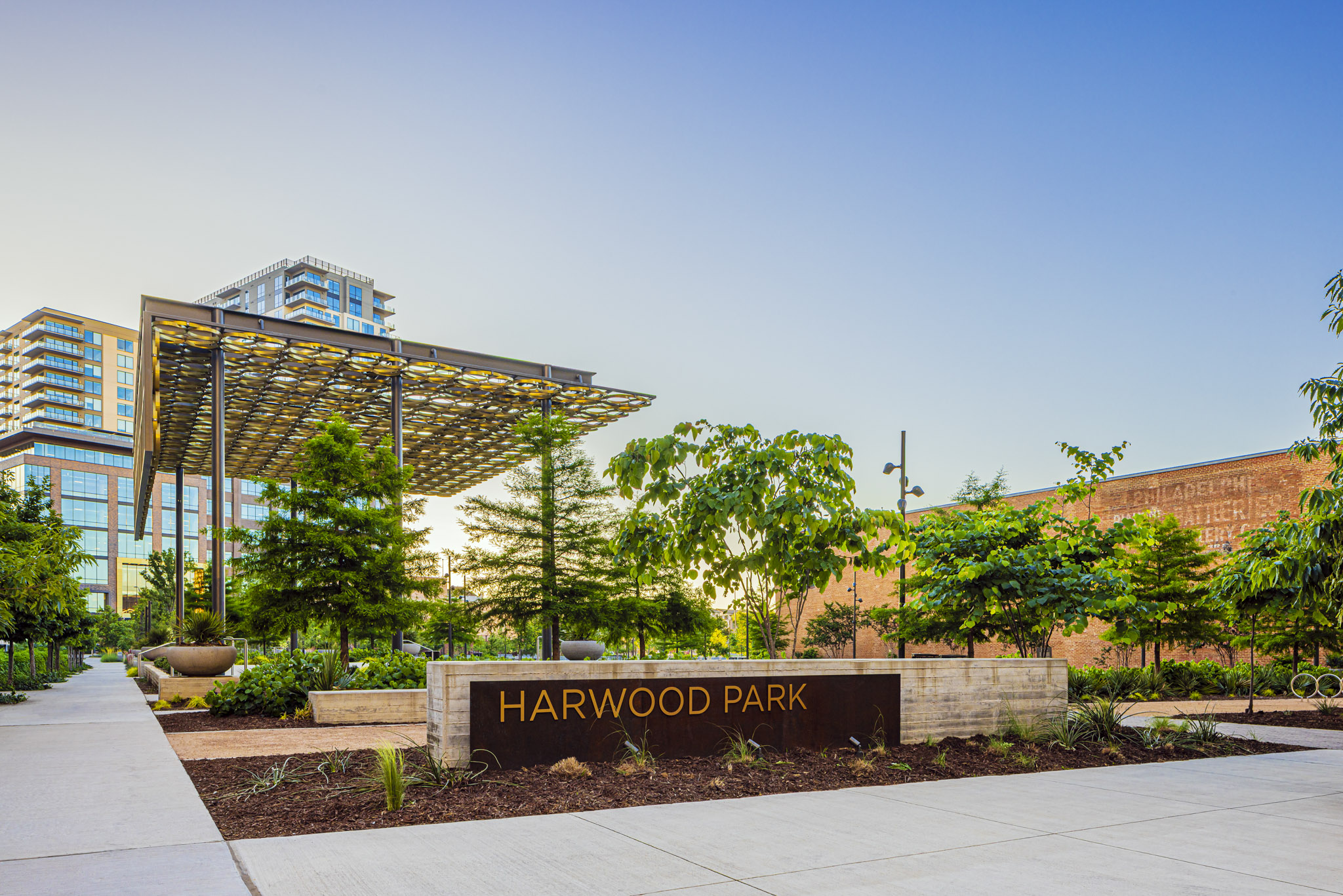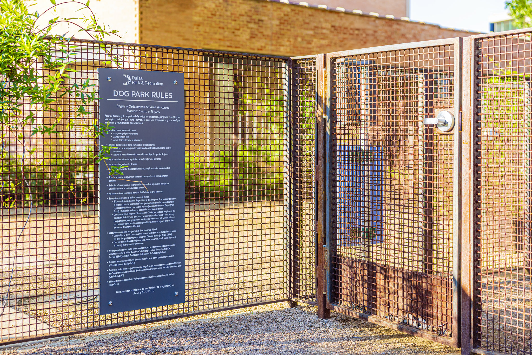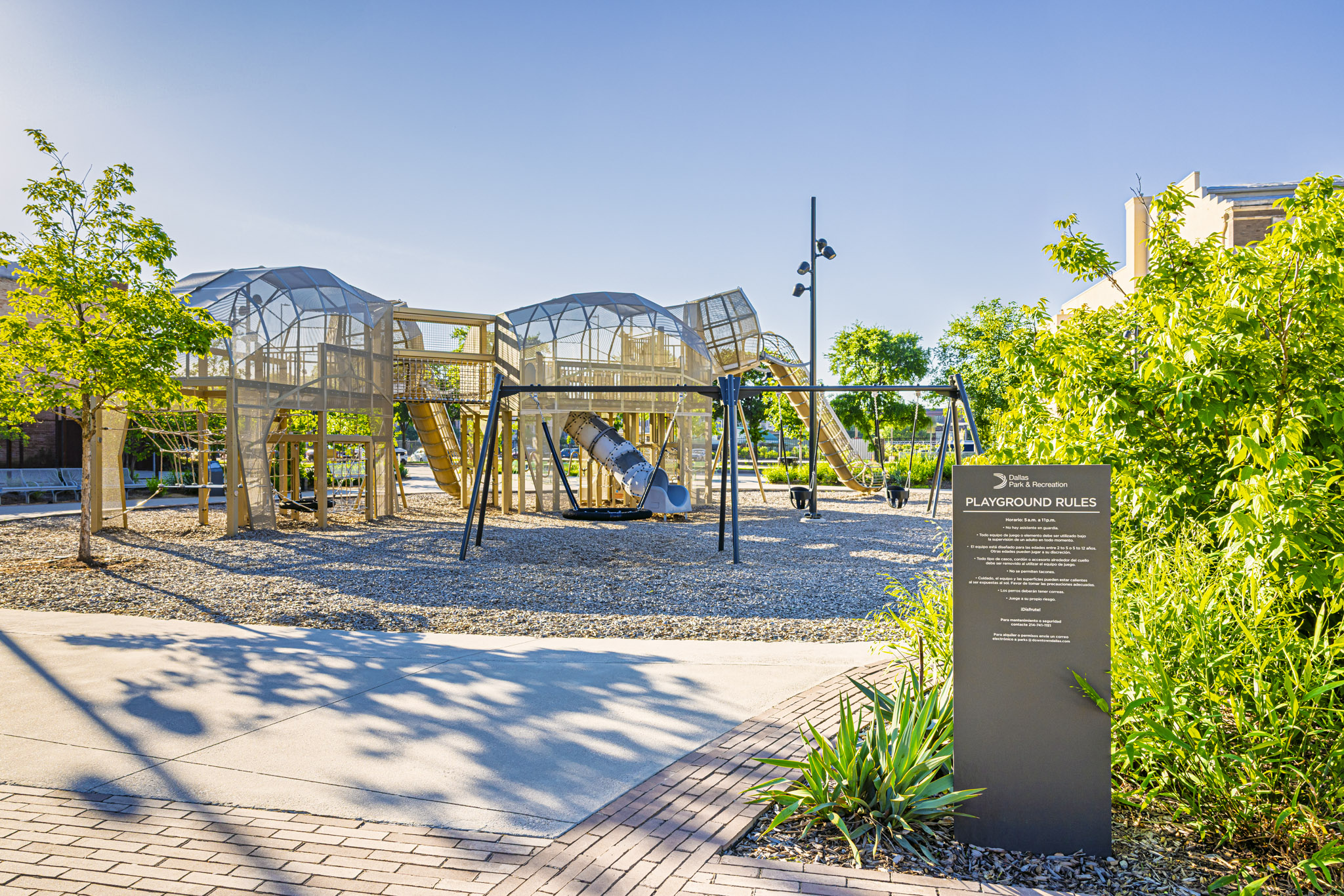 This new park in Dallas, Texas reclaimed over 4 acres in Downtown Dallas packed with park features including a mammoth playground, interactive water feature, a sport court for pickleball and basketball, 2 dog parks, and a striking gold ring pavilion at the Harwood and Jackson Street entrance. focusEGD provided Wayfinding and Signage design for the project.