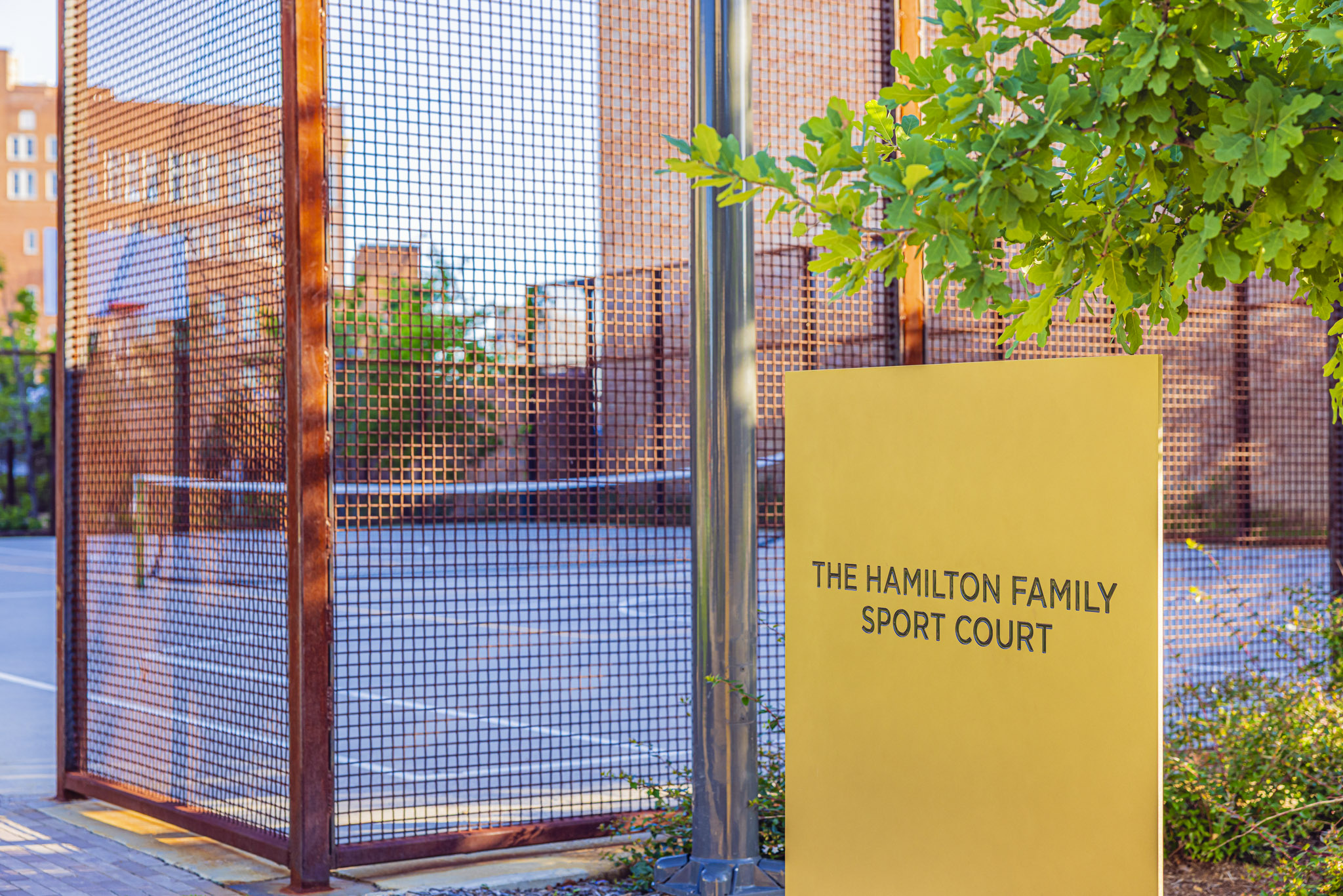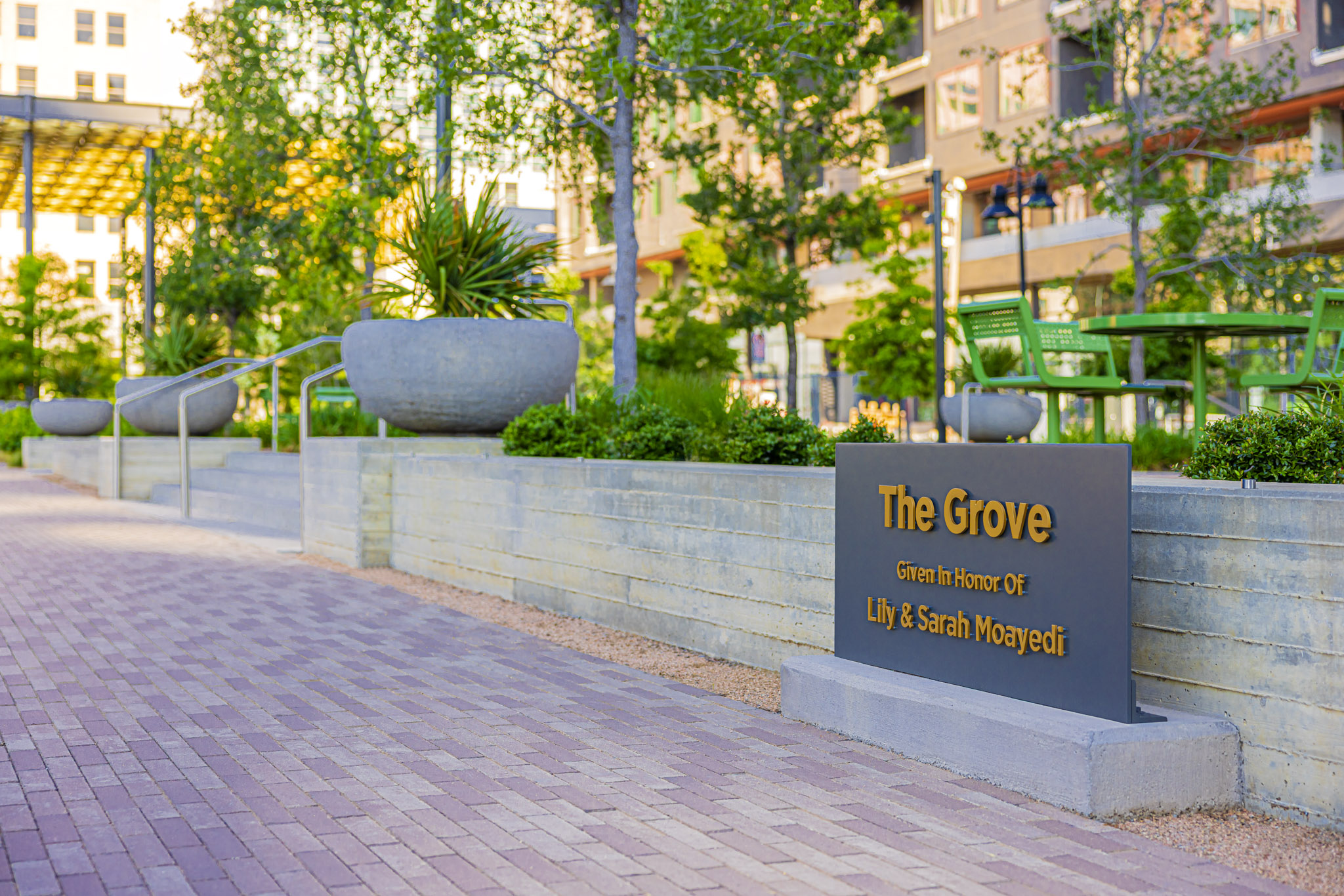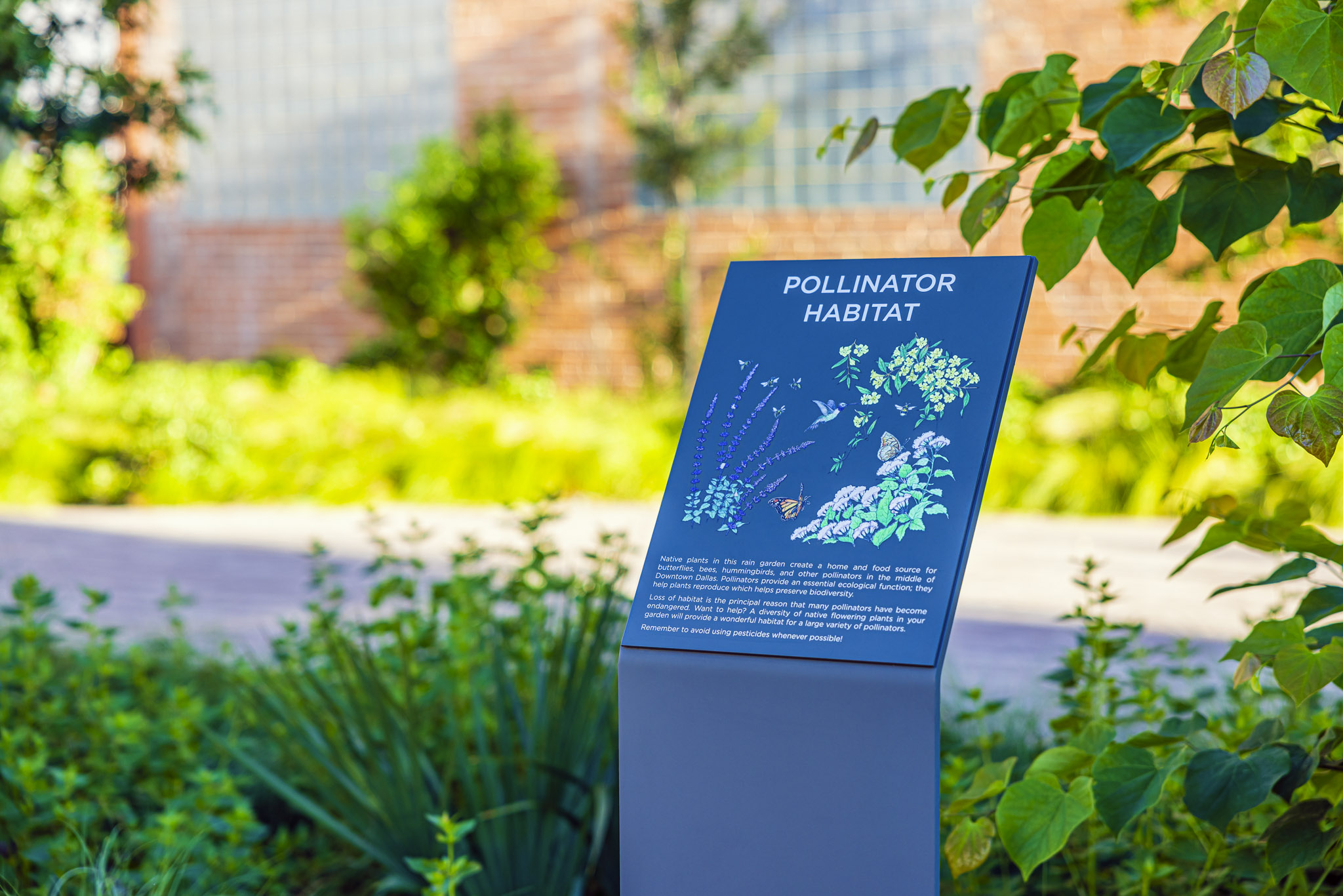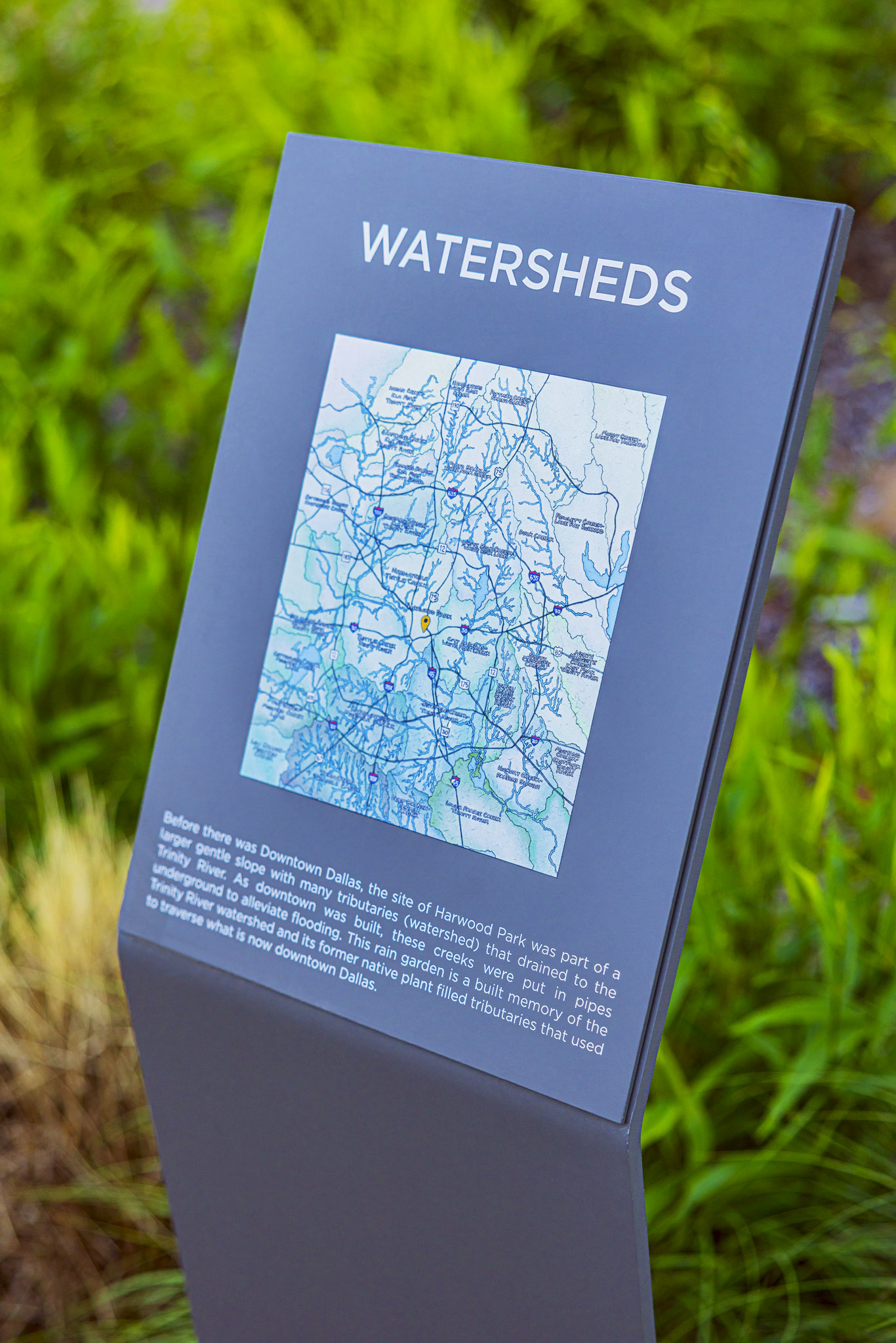 This new park in Dallas, Texas reclaimed over 4 acres in Downtown Dallas packed with park features including a mammoth playground, interactive water feature, a sport court for pickleball and basketball, 2 dog parks, and a striking gold ring pavilion at the Harwood and Jackson Street entrance. focusEGD provided Wayfinding and Signage design for the project.