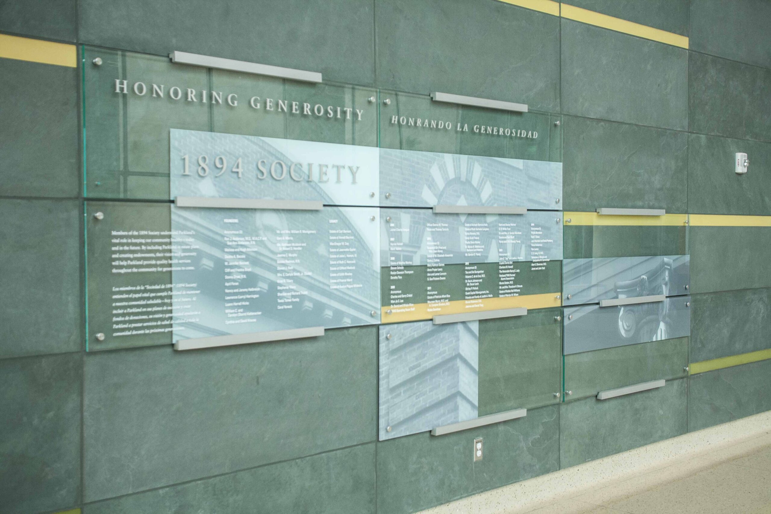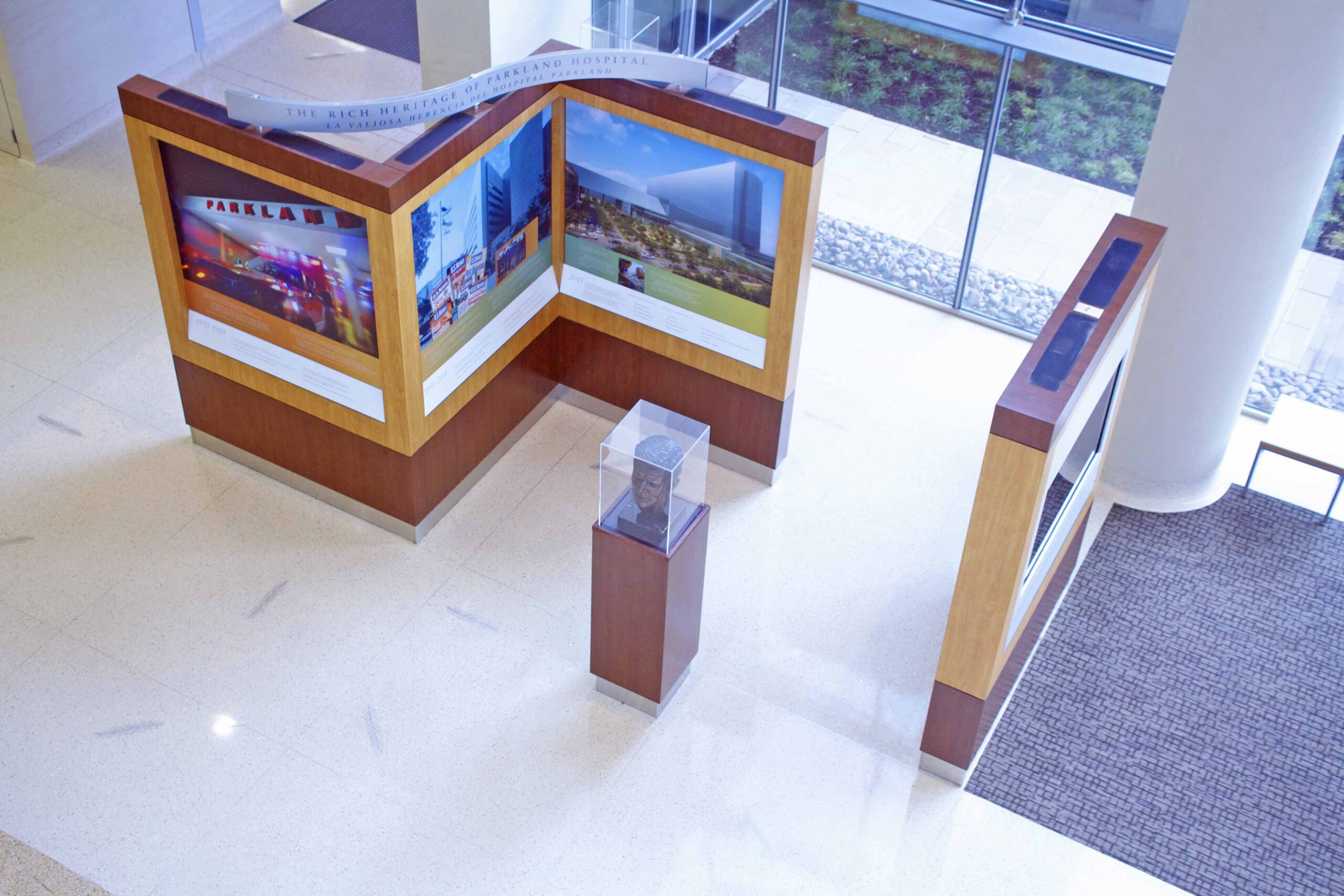 Because of its historical past and strong ties to the community, historic features such as the JFK Memorial and artifacts were relocated to the new building’s lobby along with a history wall telling of Parkland’s beginnings, and a digital display of the new Parkland being built. Donor recognition displays include a large capital campaign, community integration, employee recognition and a building facade full of county community donors applied to the glass.